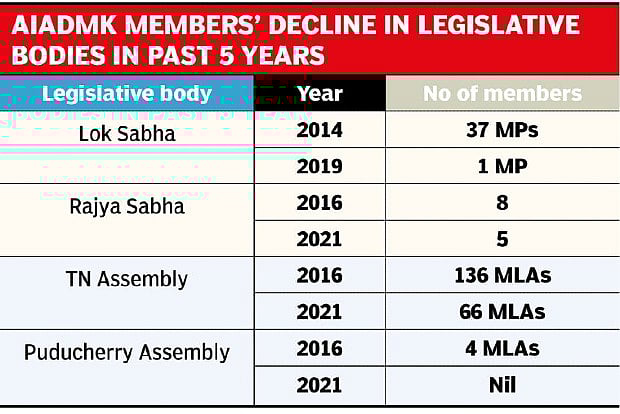 During the times of charismatic J Jayalalithaa, the AIADMK was the Opposition party in neighbouring Puducherry, but now the party has no MLAs in the union territory. Similarly, the AIADMK is no more the third-largest party in the Lok Sabha. From 37 MPs - the number had dwindled to just one MP representing the Theni constituency.