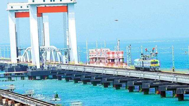 The new rail bridge across the Pamban sea was constructed at a cost of Rs 645 crore and was inaugurated on April 6. All trains from Chennai, Madurai, Tiruchy, Kanniyakumari and Thiruvananthapuram to Rameswaram operate through this bridge. The bridge has been designed to facilitate electric train operations.