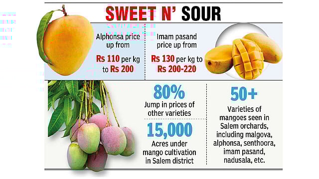 Salem: “Prices of most varieties of mangoes have increased on an average by 50 to 80 per cent this year. Mango prices skyrocketed as farmers managed to harvest only 10 to 15 per cent of the usual yield,” said A Jayapal, president of Salem Mango Traders' Association.