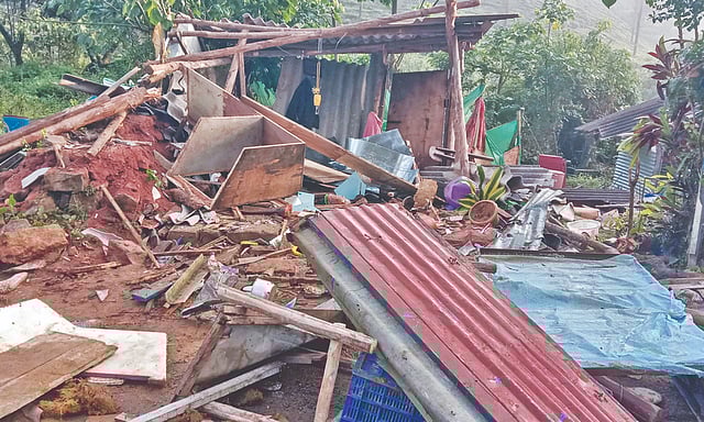 A herd of eight elephants, including a calf, strayed into Vellamalai Estate on Tuesday, early morning, in search of food. They first damaged a tea shop before going on a damaging spree targeting houses. They broke the walls, doors, and windows of around four asbestos-roofed houses. One of them had completely crumbled in the impact of the attack.