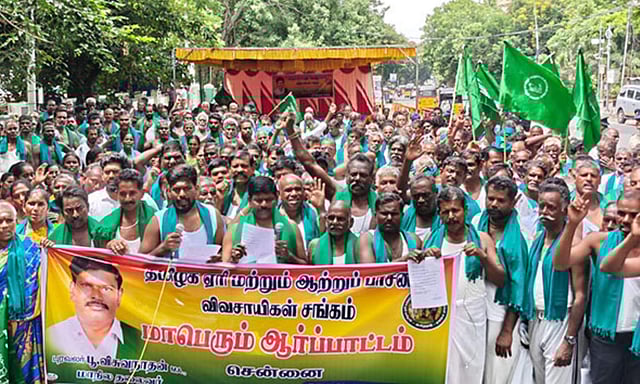 CHENNAI: Members of the Tamil Nadu River and Tank Irrigation Farmers Association staged a protest near Rajarathinam Stadium in Egmore, Chennai, on Thursday, demanding immediate government action on crop damage compensation, agricultural budget implementation, and policy reforms.