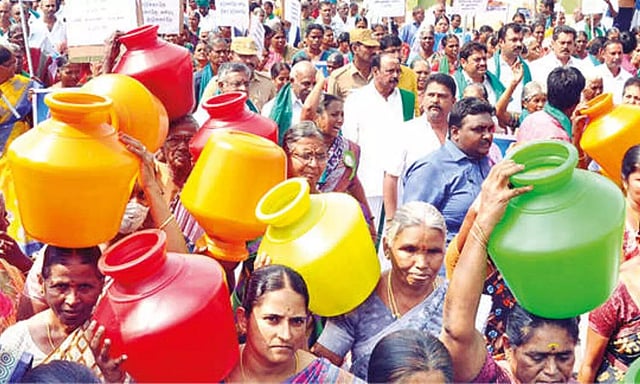 Farmers, including a large number of women who arrived with empty pots, from Erode, Tiruppur and Karur districts took part in the protest. Spearheaded by Kongunadu Makkal Desia Katchi (KMDK) general secretary and Tiruchengodu MLA ER Eswaran, the rally had top names of the region including BJP’s state agricultural wing president GK Nagaraj, Hindu Munnani state president Kadeswara Subramaniam and Lower Bhavani Farmers Welfare Association president S Nallasamy.