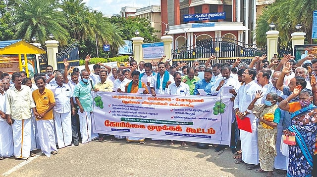 Farmers have been staging a series of protests demanding the government to fix the price at Rs 130 for a kg of copra. Since their demands were not fulfilled, they staged a protest led by Coconut Farmers Federation district president EV Gandhi on Wednesday in front of the Thanjavur Collectorate.