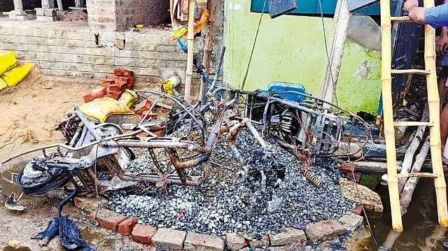 TIRUCHY: Two electric scooters and a car were reduced to ashes after one of the scooters caught fire while charging in Kumbakonam on Monday.