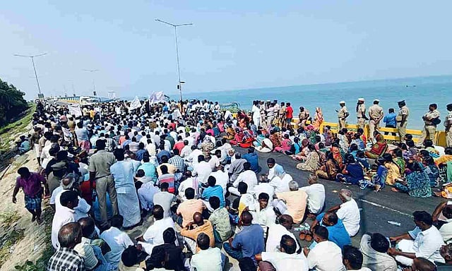MADURAI: Fishermen upset over a spate of mid-sea arrests by the Sri Lankan Navy have taken the prestigious Pamban bridge as an icon for registering their protests, with hundreds blocking the road bridge on November 12 over the arrest of 23 fishermen on November 9.