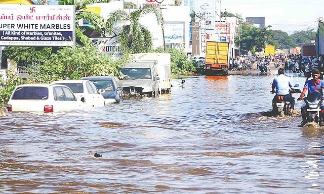 Vehicles queued up for over one km on the flooded NH, while cars and two-wheelers parked beneath the Butterfly flyover were drowned.