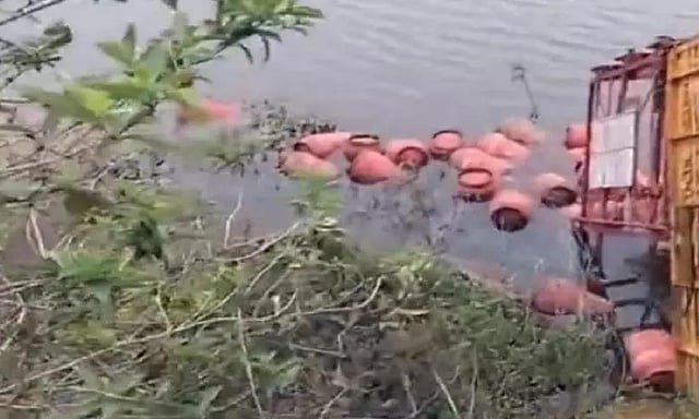Visuals showed several LPG cylinders that fell from the lorry floating about in the lake.