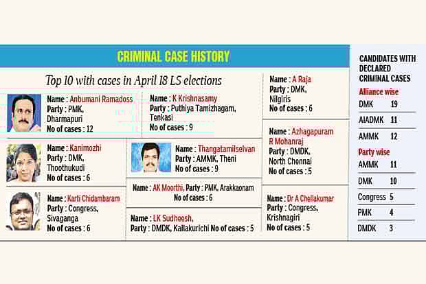 AMMK’s Thangatamilselvan (Theni LS seat) and Puthiya Tamizhagam president Dr K Krishnasamy (Tenkasi) come second with nine cases pending against them. DMK’s Kanimozhi and A Raja and Congress Karti Chidambaram have six criminal cases against them.
