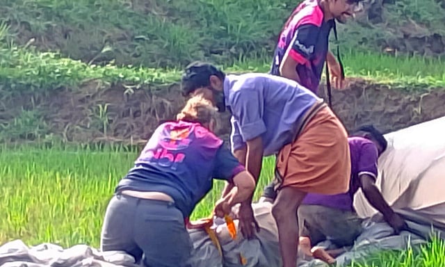 One of the balloons in the shape of an elephant drifted away and landed in a farm field in Kannimari in Palakkad on Tuesday. With the help of local villagers, the hot air balloon was wrapped and brought back.