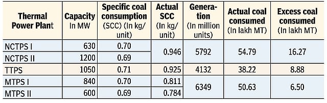 Overall, all the five thermal power plants have generated 16,273 million units of power in 2021-22 till February, according to the SRLDC data. As per the designed SPCC of the respective thermal power plants, they should have consumed only 111.97 lakh MT of coal for generating 16,273 million units but it consumed 143.64 lakh MT of coal, which is 31.66 lakh MT in excess.