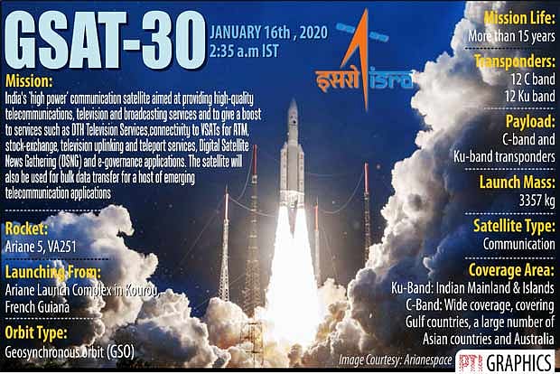 “GSAT-30 has a unique configuration of providing flexible frequency segments and flexible coverage. The satellite will provide communication services to Indian mainland and islands through Ku-band and wide coverage covering Gulf countries, a large number of Asian countries and Australia through C-band,” ISRO Chairman Dr K Sivan said.