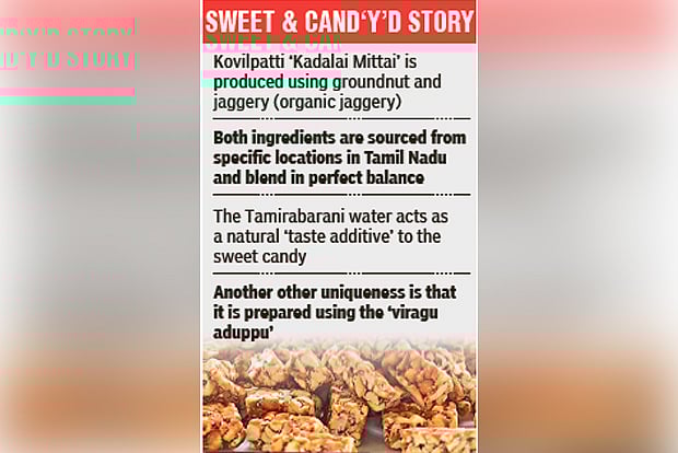 The tag was granted to Kovilpatti ‘Kadalai Mittai’ to its unique flavourfrom the use of jaggery, groundnuts grown in the native black soil and natural ingredients. The other uniqueness includes the use of Veragu Aduppu (firewood).
