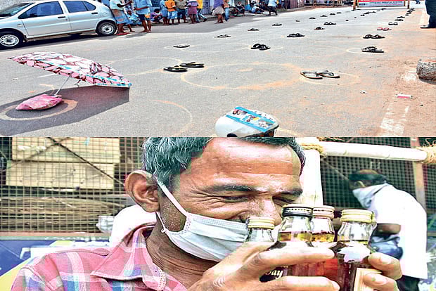 Circles were drawn outside shops to ensure social distancing and the customers placed their footwear, umbrella, helmets in circles to reserve their spot to avoid hot sun and waited near the shady places.