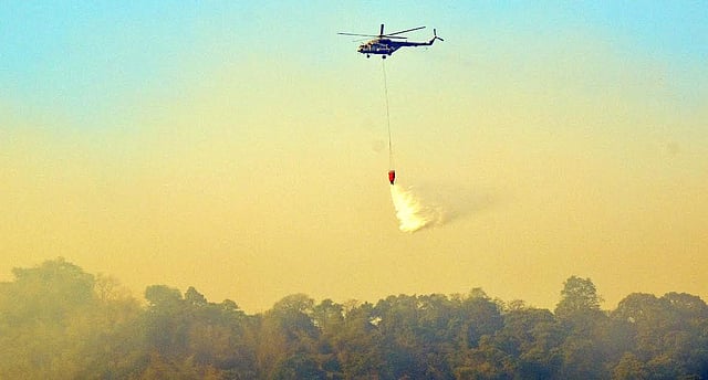 COIMBATORE: A helicopter from Indian Air Force (IAF) station in Sulur was pressed into service to douse the fire, raging for the sixth consecutive day at the Madukkarai forest range in Coimbatore on Sunday.