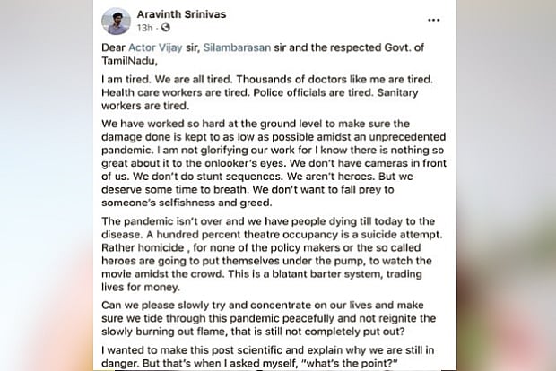 In an open letter on FB that went viral, Aravinth Srinivas, a junior resident at Jawaharlal Institute of Postgraduate Medical Education & Research, said, “I am tired. We are all tired. Thousands of doctors like me are tired...We don’t have cameras in front of us. We don’t do stunt sequences. We aren’t heroes. But we deserve some time to breathe. The pandemic isn’t over and we have people dying… A hundred percent theatre occupancy is a suicide attempt...”