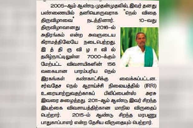 The reference about the contribution made by ‘Nel’ Jayaraman, who had collected more than 175 varieties oftraditional rice seeds, in the Botany text book have delighted the delta farmers.