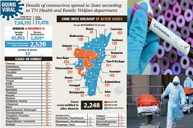 A total of 12 deaths were notified on Sunday, all of whom had comorbid conditions. Five of these were in Chennai, while Kancheepuram, Tiruvallur, Madurai, Coimbatore, Erode, Vellore and Cuddalore added one each. With this, the COVID-19 toll in the State has reached 11,478.