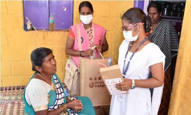 After screening them, field workers delivering prescribed medicines for the needy at their doorsteps.