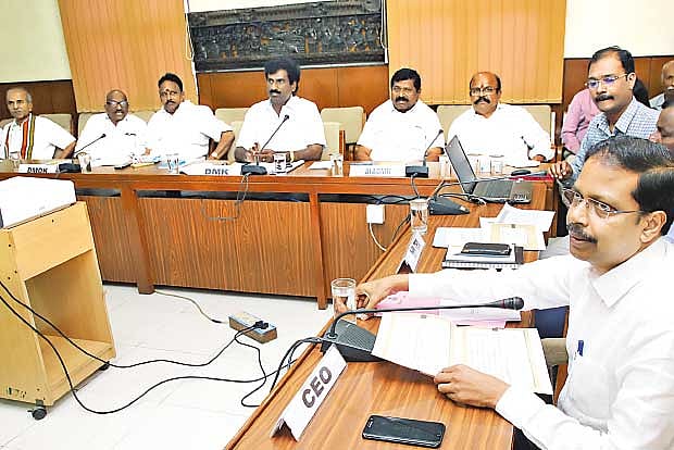 AIADMK leader Pollachi Jayaraman, who attended the meeting, urged the CEO to recommend for a single phase polls in the state. The AIADMK also demanded the public election department not to restrict the summer drinking water projects citing model code of conduct. “The DMK has raised objections to the double and multiple entries in voters roll and specific examples have been given in connection with RK Nagar constituency,” DMK’s north Chennai functionary R Girirajan said.