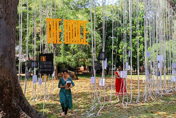 ‘The Voice’ features audio recordings from Krishnamurti’s speeches playing under a white banyan tree. According to Desai, as the banyan was an important motif for Krishnamurti and his followers, ropes were added to the tree with excerpts from his speeches.