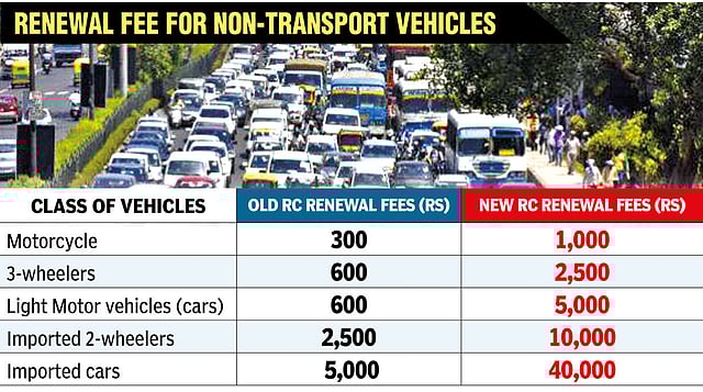 Now, RC renewal for a 15-year-old car would cost Rs 5,000 as against Rs 600 previously, while it is Rs 1,000 (old fee Rs 300) for two-wheelers and Rs 2,500 (old fee Rs 600) for auto-rickshaws. For imported two-wheelers, it is Rs 10,000 (up from Rs 2,500) and Rs 40,000 for imported cars (from Rs 5,000).