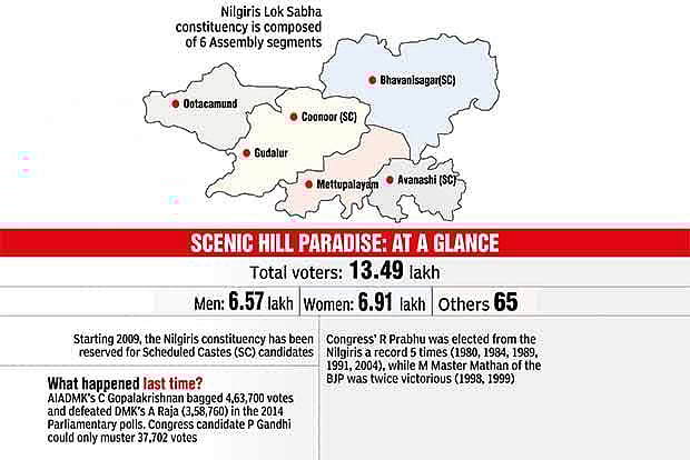 The Nilgiris LS constituency encompassing Mettupalayam, Avanashi (SC), Bhavanisagar (SC), Coonoor (SC), Ooty and Gudalur Assembly segments, remained a citadel of the Congress since 1957. The party’s former minister R Prabhu won consecutively for four times in 1980, 1984, 1989 and 1991 and again in 2004. The DMK, the AIADMK and the BJP have each won twice from the hill constituency.