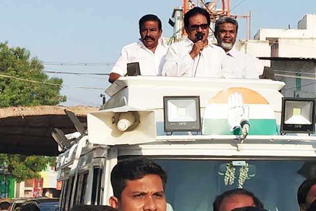 Caption: DMK former minister KN Nehru and Congress candidate Su Thirunavukkarasar campaigning in Tiruchy on Monday