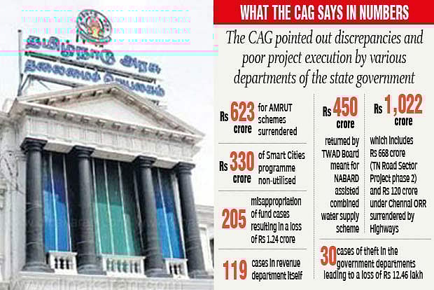 Various commissioners of municipal administration during their tenure submitted due to non-utilisation of funds for implementation of these schemes have an AMRUT sanctioned sum of Rs 623 crore. Similarly, NABARD assisted combined water supply scheme executed by TWAD board also surrendered funds amounting to Rs 450 crore. In the implementation of Smart Cities programme Rs 330 crore were also surrendered due to non-utilisation of funds, the CAG said.