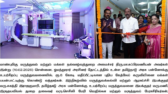 CHENNAI: The Tamil Nadu government on Tuesday commissioned a second state-of-the-art cardiac catheterisation laboratory (cath lab) at the Tamil Nadu Government Multi Super Speciality Hospital (TNGMSSH), Omandurar estate at a cost of Rs 8 crore, strengthening emergency heart care services amid a steady rise in cardiovascular diseases.