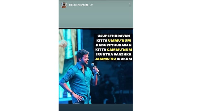 In the Story, Sibiraj shared a quote from Vijay’s speech from Sarkar's audio launch in 2005, along with a picture of the actor: “Usupethuravan kitta ummu’num, kadupethuravan kitta cammu’num iruntha vaazhkai jammu’nu irukum”, translating to, if you stay silent with those who provoke and remain calm with those who irritate, life will be great. While he made no direct reference to the ongoing row, the timing has led many to interpret it as an indirect show of support for Vijay. Later, a video of him endorsing a TVK candidate too made the rounds on social media.