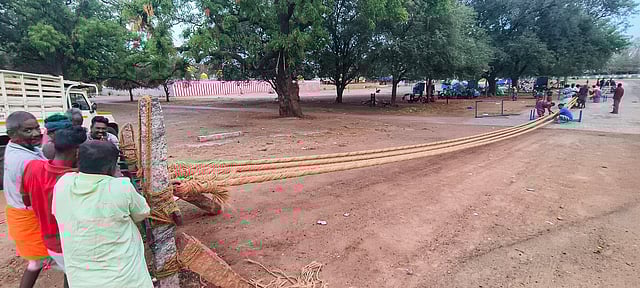 At the Sevugapperumal Ayyanar temple premises, strands of coir made from coconut fibre are carefully twisted and layered into a rope stretching about 300 feet, with a thickness of nearly 18 inches. Each step is done by hand, requiring coordination and sustained physical effort.