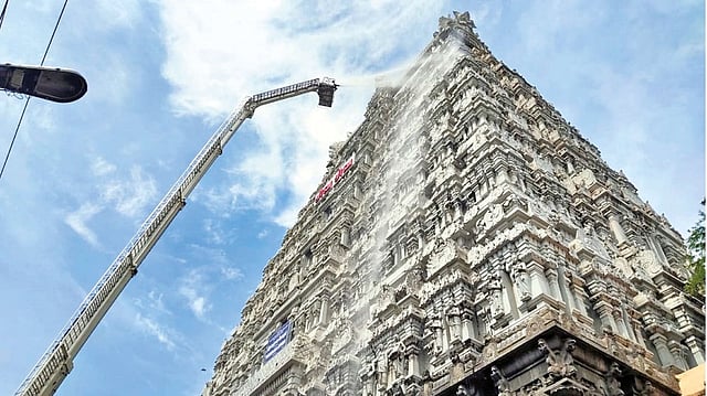 Sources said, the exercise was launched by Collector B Murugesh after he noticed that the towers were full of bird droppings from thousands of pigeons nesting on them. “When Murugesh inspected the premises recently, he noticed the droppings of the birds and got in touch with the fire services DGP in Chennai based on which a sky crane arrived at the temple for the washing on Friday,” an official said.