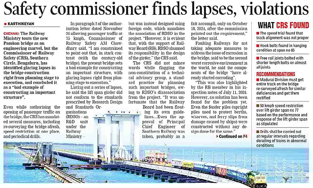 CHENNAI: Reacting to DT Next story on lapses and deficiencies in the construction of the Pamban bridge, Southern Railway on Thursday clarified that the Pamban Bridge was designed by international consultant TYPSA based on European and India codes, and it was proof checked by IIT Madras.