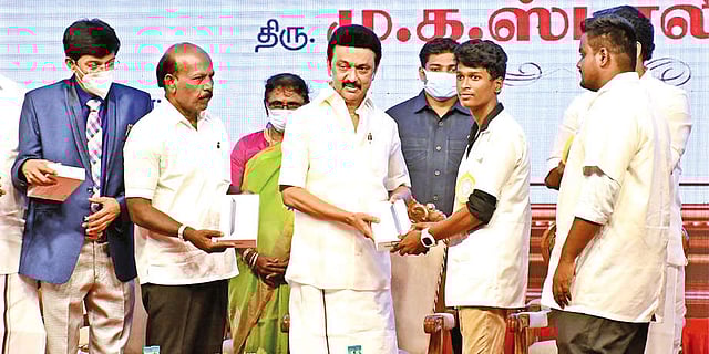 Chennai: Chief Minister MK Stalin distributed laptops to students of government schools, who have been admitted to government medical and dental colleges under the 7.5 per cent reservation quota.