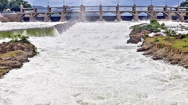 The entire water flowing into the dam, which reached its full reservoir level of 120.06 feet on July 16, is being discharged. Due to flooding, the public were not allowed to use the bridge over Cauvery River and also the bridge near the 16 eye sluices.
