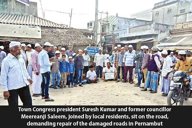 The issue pertains to a contractor being awarded the road relaying work two years ago in 2018. Asked why he had not undertaken the work, Meeranji Saleem said, “He is the benami of a local DMK functionary, who is unable to take up the work as he has taken up most of the local contracts.” As the bad condition of the road resulted in two-wheeler riders falling down frequently, the word of the dharna spreading resulted in a crowd, including former councillors Abdul Hameed and Afsal Basha, and People’s Welfare Seva Sangh joint secretary Govindasamy joining the agitation.