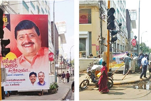 Jayaram Venkatesan of Arappor Iyakkam posted a tweet through the official handle of the organisation showing a hoarding on a footpath on North Usman Road celebrating the birthday of T Nagar MLA, J Karunanithi of the DMK. The MLA was asked to remove the hoarding before it endangers the lives of road users, as has happened several times in the past.