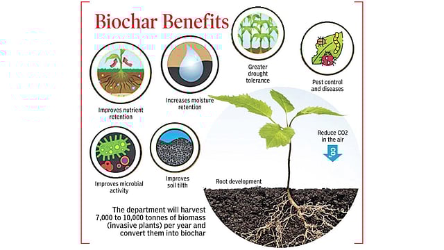 The department will harvest 7,000 to 10,000 tonnes of biomass (invasive plants) per year and convert them into biochar. Biochar is a stable carbon -rich material that enhances soil fertility, sequesters atmospheric carbon dioxide, and generates high-value carbon credits under the Voluntary Carbon Market (VCM).