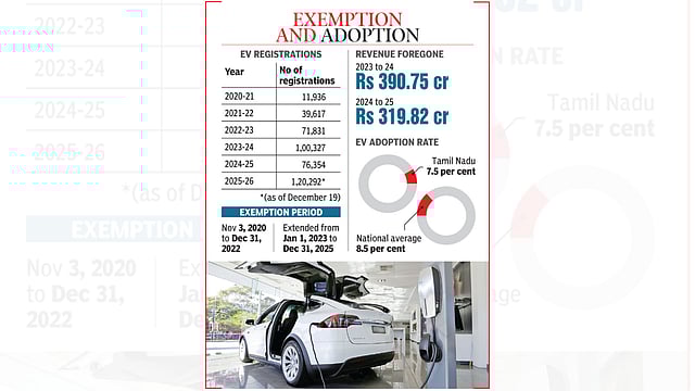 Under the Tamil Nadu Electric Vehicles Policy, 2019, the government granted full tax exemption for all battery-operated transport and non-transport vehicles from November 3, 2020, to December 31, 2022. The benefit was later extended for another three years, from January 1, 2023, to December 31, 2025.