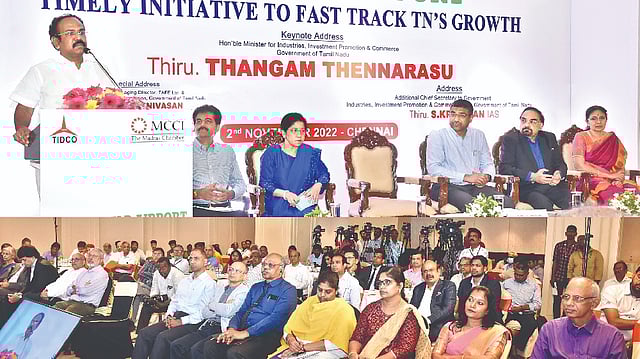 Industries Minister Thangam Thennarasu addressing a gathering organised by MCCI and TIDCO in Chennai on Wednesday