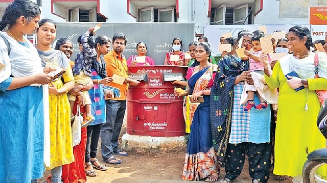 In order to compensate for the staff shortage during the COVID pandemic, the previous AIADMK government appointed 3,200 nurses on temporary basis and fixed a consolidated payment of Rs 14,000. After the COVID restrictions were lifted in December 2022, all the temporary appointments were cancelled except a few who cleared the MRB exam. As a part of ongoing protests, around 40 such nurses assembled at the Head Post Office premises and staged a protest. They also sent postcards to the Chief Minister.
