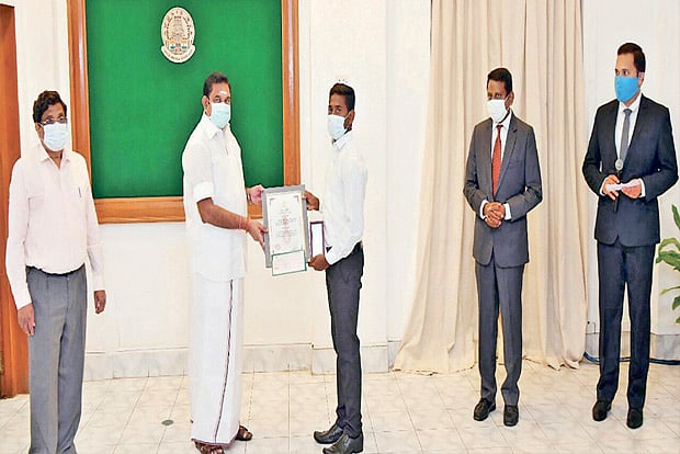 The award was handed over to Sridhar, the youth, by Chief Minister Edappdi K Palaniswami in Chennai on Monday.