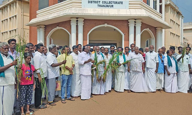 The farmers from Chithirakudi, Kalvirayanpettai, Rayanthur, Sidhaya, Gunamangalam, Vairaperuma, Ayyasamypatti, Mrudhakusi and Thiruvenka Udayanpatti came to the Thanjavur Collectorate on Thursday with the damaged crops and staged a protest in the premises.