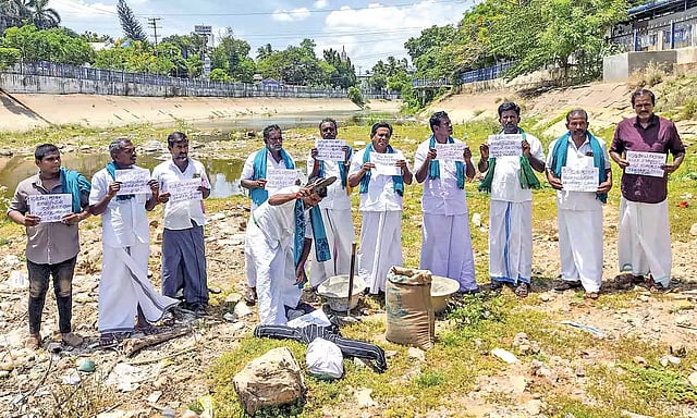 TIRUCHY: Farmers from Thanjavur on Tuesday staged a protest in the dry GA canal demanding the union government to order the Karnataka government to release due water to Tamil Nadu and remove the Jal Sakthi Minister V Somanna.