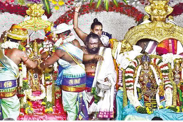 Madurai: The divine wedding was solemnised on a flower-decked stage erected at the junction of North and West Aadi streets on the temple premises. Two ‘Bhattars’ (priests) of the temple, representing the Goddess and the Lord placed the diamond-studded ‘Thaali’ (mangalsutra) on the hands of Lord Sundareswarar idol and then tied it around Goddess Meenakshi idol during the auspicious time of 10.35 am to 10.50 am amid chanting of Vedic hymns.