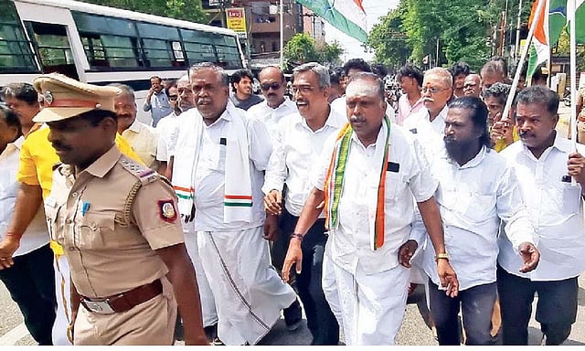 TIRUCHY: The stirring within the ruling alliance erupted into a full-fledged headache for alliance leader DMK on Thursday, after angry Congress cadres went on a rare public protest and tried to besiege the house of Rajya Sabha MP Tiruchy N Siva for his controversial remark against the late chief minister and Congress mascot K Kamaraj.