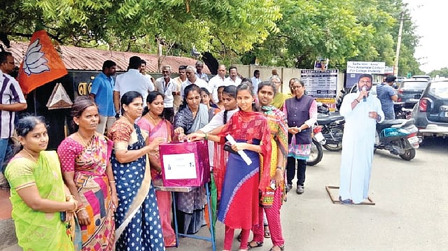 Students winning the contest were informed that they would be allowed to take selfies with BJP state president K Annamalai, when he presided over a function in Tirupur on Saturday to celebrate eight years of Prime Minister Narendra Modi’s achievements.