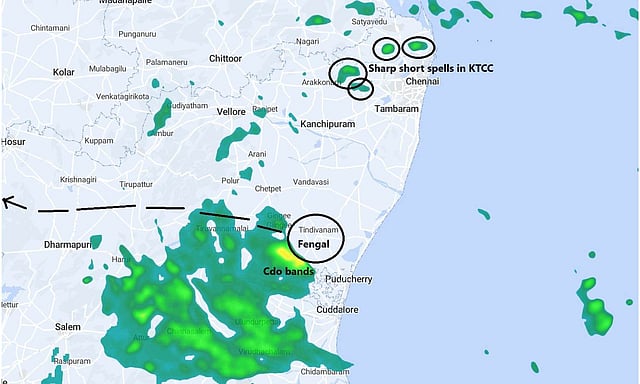 "The primary convection around the center of the Cyclonic Storm Fengal is seen gradually pushing into Tiruvannamalai district from Villupuram district. This is indicative of much needed westward movement towards interior Tamil Nadu," said weather blogger Srikanth who runs the @ChennaiRains handle on X. As a result, Tiruvannamalai is likely to see a change in intensity of rainfall, he predicted.