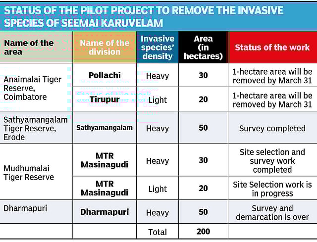 “Initially, 200 hectares have been selected by the Forest Department in areas such as Anamalai Tiger Reserve, Sathyamangalam Tiger Reserve, Mudumalai Tiger Reserve and Dharmapuri to carry out the pilot project of removing Seemai Karuvelam,” it added.
