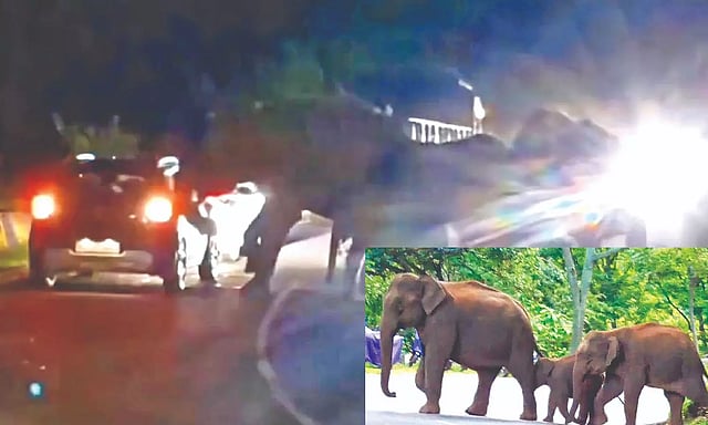Two adult elephants with their calf were annoyed as they couldn’t cross the road due to the movement of vehicles on the Tamil Nadu-Kerala inter-state border of ‘keel nadugani’ in Gudalur.